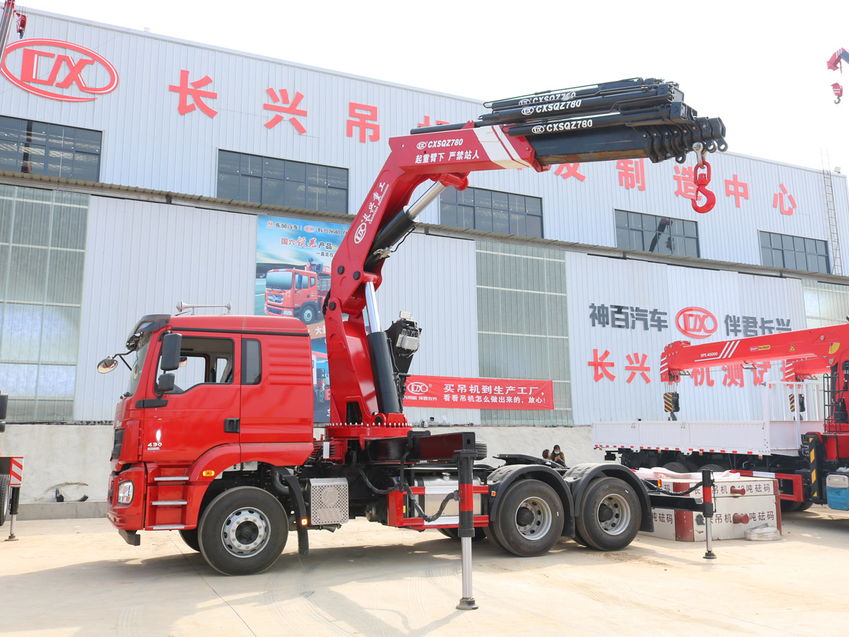 陜汽德龍新M3000駕駛室前四后八上裝長(zhǎng)興35噸折臂式吊機(jī)