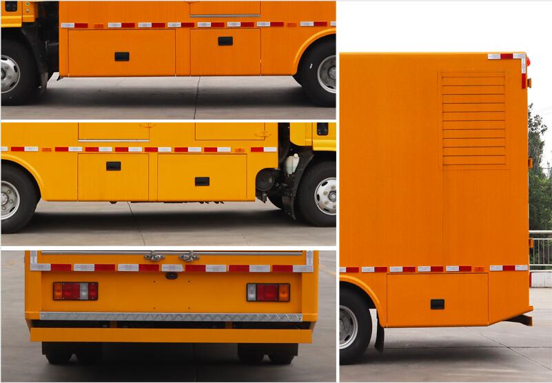該車廂內裝有發(fā)電機組,電纜絞盤,液壓(機械)支腿動力電纜,照明系統(tǒng)等設施,主要用于處理突發(fā)事件的應急搶險供電; 車廂頂部封閉且不可開啟; 側防護由車身結構替代,后下部防護材質為Q235A碳鋼,連接方式為螺栓連接,斷面尺寸(mm):100×50,后部防護離地高度(mm):385; ABS及其控制器型號為:APG3550500A,生產廠家為:浙江亞太機電股份有限公司,僅與4KH1CN6LB型發(fā)動機匹配;氣制動對應ABS及其控制器型號為:CM4XL-4S/4M,生產廠家為:廣州瑞立科密汽車電子股份有限公司; 隨底盤選裝駕駛室后視鏡,輪眉,標牌,車門標,輪轂. |