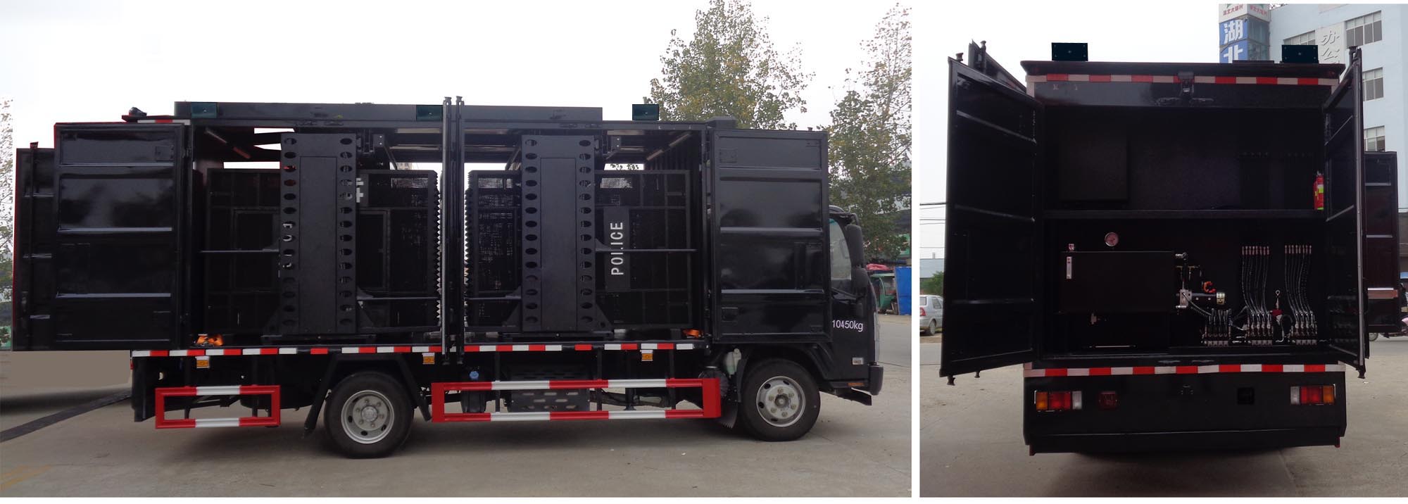 車廂頂部封閉不可開啟;該車裝有:防暴網(wǎng),液壓貨架裝載機構,強聲廣播系統(tǒng)等專用裝置,主要用于運載警用裝備;防護材料:Q235A碳鋼,連接方式:左右側面防護以及后部防采用焊接連接,后部防護斷面尺寸(mm):120×60,后下部防護離地高度(mm):380;發(fā)動機與油耗申報值(L/100km)對應關系:4HK1-TCG61/17.70,4HK1-TCG60/17.70,安裝直接供電式的ETC車載裝置;ABS及控制器型號為:APG3550500H1,生產(chǎn)廠家為:浙江亞太機電股份有限公司。 |
