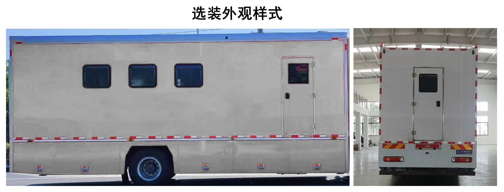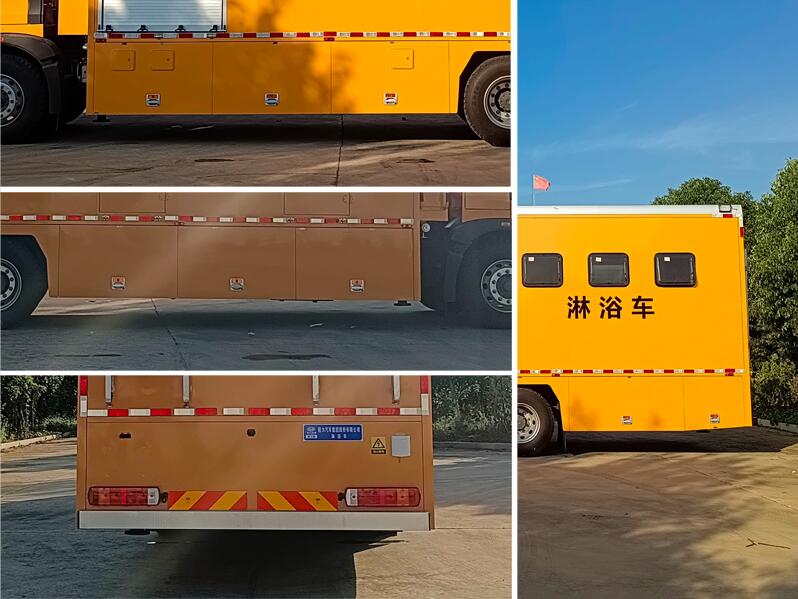該車主要用于野外淋浴保障功能,專用裝置:冷熱水供給系統(tǒng)、淋浴裝置; 廂體頂部封閉, 不可開啟; 整車長/軸距/后懸對應(yīng)關(guān)系為(mm):10330/5600/3300,10730/5800/3500; 側(cè)防護(hù)裝置為裙邊結(jié)構(gòu)代替,后防護(hù)材質(zhì)為Q235,焊接連接,截面尺寸寬×高(mm):110×120,下邊緣離地高490mm; ABS系統(tǒng)控制器生產(chǎn)企業(yè)/型號(hào)為威伯科(上海)管理有限公司/4460046300,廣州瑞立科密汽車電子股份有限公司/CM4XL-4S/4M;選裝EBS,EBS系統(tǒng)控制器生產(chǎn)企業(yè)/型號(hào)為威伯科(上海)管理有限公司/EBS3; 選裝限速裝置,最高車速(km/h)為89; 該車頂部裝有照明燈,起夜間照明作用,行駛過程中不可點(diǎn)亮; 選裝側(cè)后部外觀樣式.