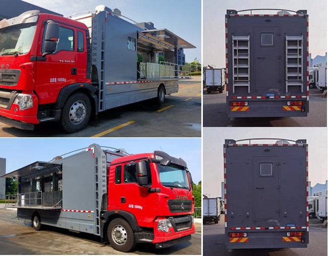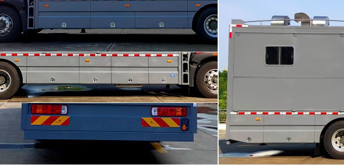 該車(chē)用于烹飪食品,餐飲加工,廂內(nèi)內(nèi)部設(shè)備有炊具,灶臺(tái),冰箱等.側(cè)面防護(hù)為整體式裙板結(jié)構(gòu),材料為Q235A碳鋼,后部防護(hù)裝置材料:Q235A碳鋼.連接方式:采用螺栓連接+焊接連接.后部防護(hù)斷面尺寸(mm):120×60,后部防護(hù)離地高度(mm):400.ABS系統(tǒng)控制器生產(chǎn)企業(yè)/型號(hào)為威伯科(上海)管理有限公司/4460046300,廣州瑞立科密汽車(chē)電子股份有限公司/CM4XL-4S/4M;選裝EBS,EBS系統(tǒng)控制器生產(chǎn)企業(yè)/型號(hào)為威伯科(上海)管理有限公司/EBS3.選裝限速裝置,最高車(chē)速(km/h)為80,89.整車(chē)長(zhǎng)/軸距/前懸/后懸(mm)對(duì)應(yīng)關(guān)系為:10250/5800/1430/3020,10180/5800/1430/2950,10050/5600/1430/3020,9980/5600/1430/2950.該車(chē)正后部裝有工作照明燈,行駛過(guò)程中不能點(diǎn)亮,僅在停車(chē)時(shí)起照明作用.隨底盤(pán)選裝駕駛室.僅選用鋼板彈簧懸架.廂體僅在停車(chē)狀態(tài)下可展開(kāi),行駛過(guò)程中不能打開(kāi).選裝倒車(chē)影像.選裝不同的正后部外觀樣式. |